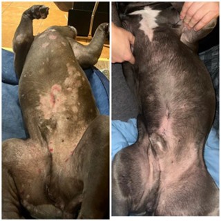 - Kairėje – aiškiai matosi odos ir kailio problemos: praretėjęs kailis, odos sausumas, vietomis oda stipriai paraudusi;
