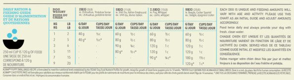 Kai kalbama apie ACANA maistą šunims, kiekvienas ingredientas yra svarbus. Štai kodėl mūsų ACANA Puppy Small Breed receptas sukurtas tam, kad aprūpinti mažų veislių šuniukus baltymais ir kitomis reikalingomis maistinėmis medžiagomis. Šiame recepte net 70 % kokybiškų gyvūninių ingredientų, tokių kaip šviežia kanadietiška vištiena ir neapdirbtos plekšnės. Gyvūniniai ingredientai taip pat subalansuoti su vaisiais, daržovėmis ir žolelėmis, šie ingredientai sudaro apie 30 %. Visi naudojami produktai yra švieži bei kokybiški.