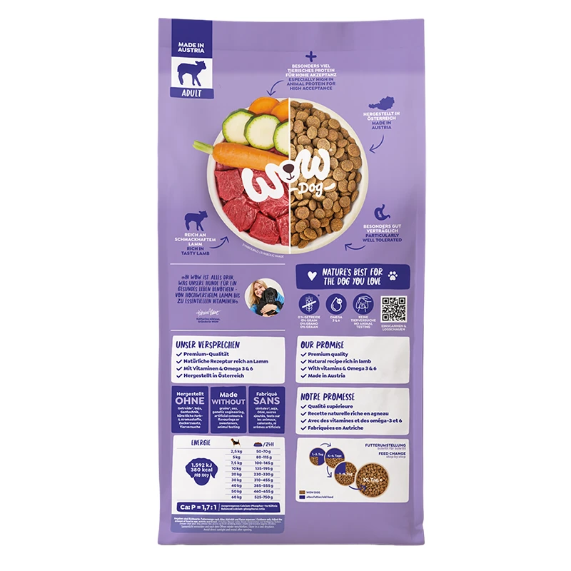 Džiovinta ėriena 20 %, bulvės, saldžiosios bulvės 17 %, žirniai, paukštienos riebalai, hidrolizuoti paukštienos baltymai 8 %, džiovinti paukštienos baltymai 4 %, runkelių minkštimas (cukrus pašalintas), lašišų aliejus 1,5 %, linų sėmenys, cukinijos 0,2 %, morkos 0,1 %, FOS 0,1 %, MOS 0,1 %, yucca schidigera.