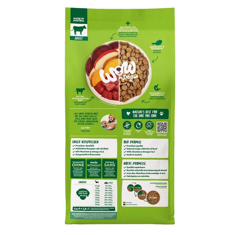 Džiovinta jautiena 32 %, bulvės, saldžiosios bulvės 22 %, jautienos riebalai, runkelių minkštimas (cukrus pašalintas), mineralinės medžiagos, rapsų aliejus 3 %, linų sėmenys, obuoliai 0,1 %, burokėliai 0,1 %, FOS 0,1 %, MOS 0,1 %, yucca schidigera.