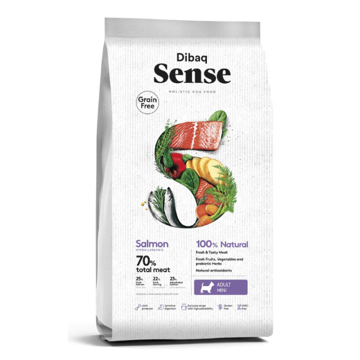 Dibaq Sense begrūdis maistas šunims su lašiša mini granulėmis.