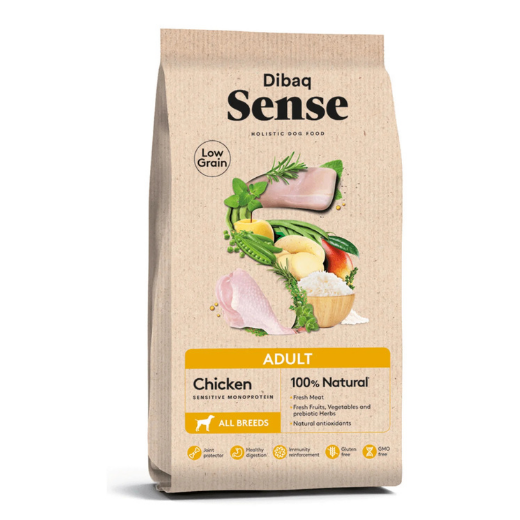 Dibaq Sense Low grain maistas šunims su vištiena ir ryžiais.
