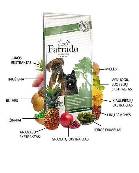 FARRADO super premium klasės begrūdis maistas šunims, kurio sudėtyje yra didelis kiekis, net 60%, aukštos kokybės vienos rūšies mėsos, todėl jis puikiai tinka alergiškiems šunims!