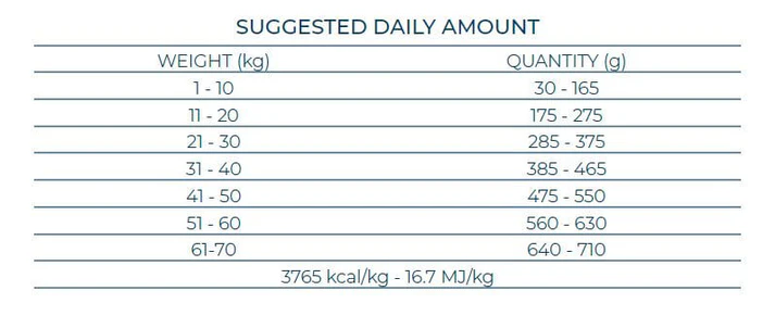 Analitinės sudedamosios dalys: žali baltymai 26%, žali riebalai 14%, žalia ląsteliena 2,7%, žali pelenai 7,1%, Omega-3+Omega-6 2,5%. Energinė vertė: 3765 kcal/kg- 16,7 MJ/kg.