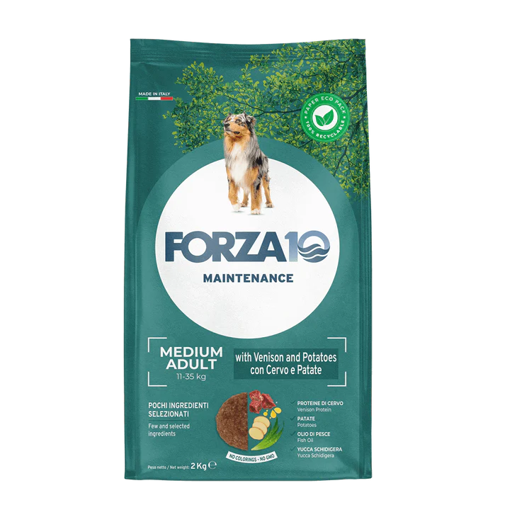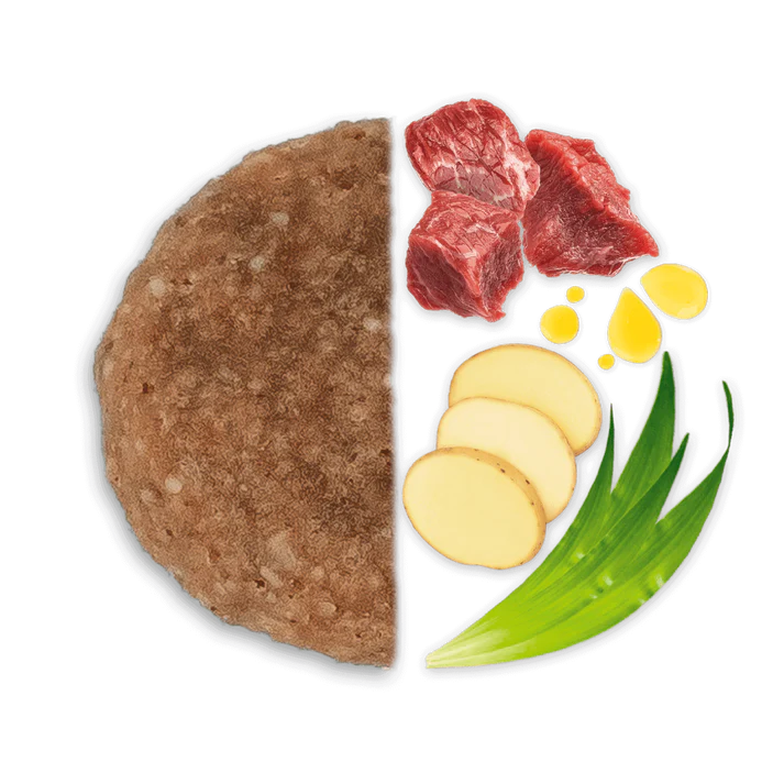 Sudėtis: dehidratuoti gyvūniniai baltymai 19% (ėriena, elniena 4,1%), baltieji sorgai, ryžių pamiltės, kukurūzai, kukurūzų glitimas, bulvės 4,1%, malti ryžiai, runkelių griežiniai 4%, vištienos riebalai, dehidratuoti kiaulienos baltymai, žuvų taukai 1,3%, hidrolizuoti gyvūniniai baltymai, kukurūzų aliejus, mineralai, mananoligosacharidai (MOS) 0,13%, fruktooligosacharidai (FOS) 0,05%, šeriuotosios jukos (Yucca schidigera) 0,024%.