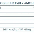 Analitinės sudedamosios dalys: žali baltymai 25%, žali riebalai 12%, žalia ląsteliena 2,5%, žali pelenai 8%, Omega3+Omega6 2,4%. Energinė vertė: 3614 kcal/kg- 15,1 MJ/kg.