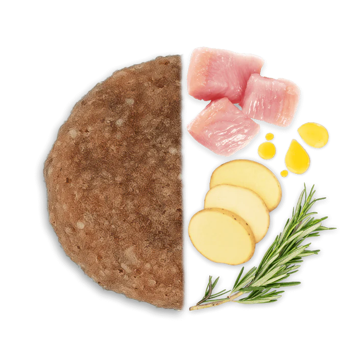 Sudėtis: dehidratuoti vištienos baltymai 21%, baltieji sorgai, kukurūzai, ryžių pamiltės, runkelių griežiniai 5%, bulvės 4%, vištienos riebalai, malti ryžiai, hidrolizuoti gyvūniniai baltymai, dehidratuota žuvis, žuvų taukai 1%, mineralai, mananoligosacharidai (MOS) 0,2%, fruktooligosacharidai (FOS) 0,08%, šeriuotosios jukos (Yucca schidigera).