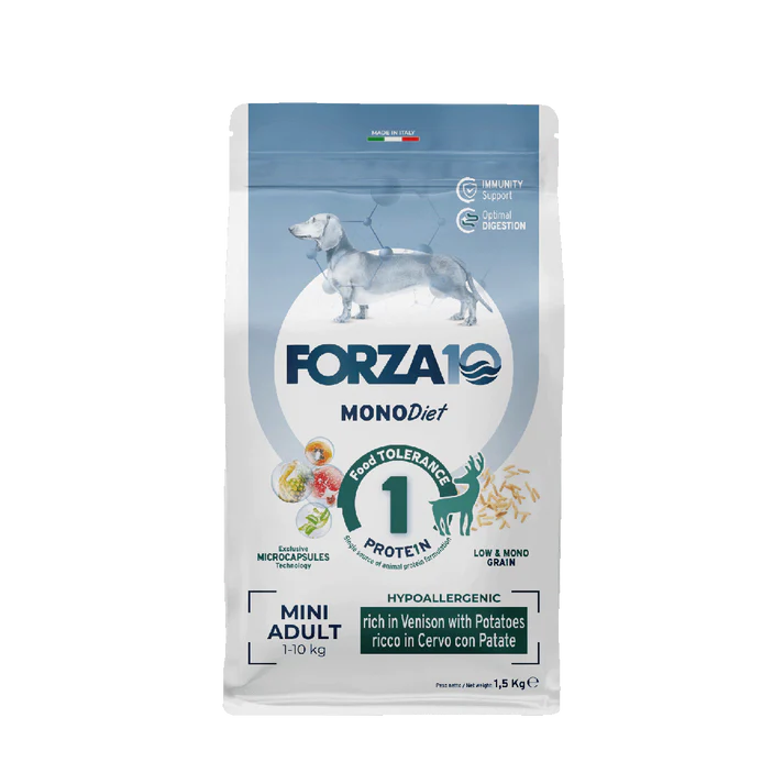 Sudėtis: dehidratuoti elnienos baltymai 16%, malti ryžiai 14%, sveiki žirniai, kukurūzų baltymai, bulvės 10%, ryžių pamiltės, aliejai ir riebalai (iš kurių žuvų taukai 2,6%), alaus mielės, runkelių griežiniai, hidrolizuoti gyvūniniai baltymai, mineralai, mananoligosacharidai (MOS) 0,2%, fruktooligosacharidai (FOS) 0,08%, kuokštinė grifolė (Grifola frondosa) 0,027%, šviežių vaisių ir daržovių perdirbimo produktai bei gretutiniai produktai: papajinis melionmedis (Carica papaya) 0,025%, augalų perdirbimo produktai: valgomasis ananasas (Ananas spp.) 0,025%, šeriuotosios jukos (Yucca schidigera) 0,024%, žolelių perdirbimo produktai: (Aloe vera 0,013%), dumbliai (Haematococcus pluvialis (astaksantinas 0,005%)).