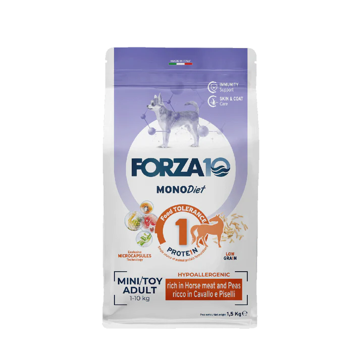 Sudėtis: dehidratuoti arklienos baltymai 17%, baltieji sorgai, sveiki žirniai 16%, malti ryžiai, kukurūzų baltymai, ryžių pamiltės, alaus mielės, vištienos riebalai, runkelių griežiniai, žuvų taukai, hidrolizuoti gyvūniniai baltymai, mineralai, mananoligosacharidai (MOS) 0,2%, fruktooligosacharidai (FOS) 0,08%, augaliniai aliejai ir riebalai: gvinėjinė alyvpalmė (Elaeis guineensis), kuokštinė grifolė (Grifola frondosa) 0,027%, šviežių vaisių ir daržovių perdirbimo produktai bei gretutiniai produktai: papajinis melionmedis (Carica papaya) 0,025%, augalų perdirbimo produktai: valgomasis ananasas (Ananas spp.) 0,025%, šeriuotosios jukos (Yucca schidigera) 0,024%, žolelių perdirbimo produktai: tikrasis alavijas (Aloe vera) 0,013%, dumbliai (Haematococcus pluvialis (astaksantinas 0,005%)).