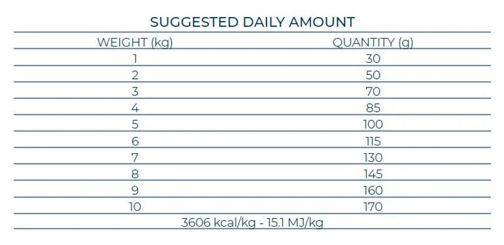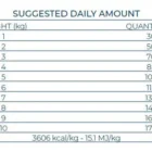 Analitinės sudedamosios dalys: žali baltymai 26,0%, žali riebalai 12,0%, žalia ląsteliena 3,2%, žali pelenai 8,0%, Omega3 0,7%, Omega6 2,1%. Energinė vertė: 3606 kcal/kg – 15,1 MJ/kg.