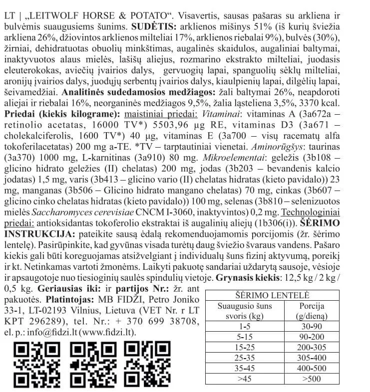 Sudėtis: arkliena(52 %) (iš jų šviežia arkliena 26 %, džiovinta arkliena 17 %, arklienos riebalai 9 %), bulvės (30 %), žirniai, obuoliai, oligosacharidai (MOS), augalinės skaidulos, lašišų aliejus, rozmarinų ekstraktas, Sibiro ženšenis, avietės, gervuogių lapai, spanguolės, aronijos uogos, juodieji serbentai, kiaulpienės, dilgėlės, šeivamedžio uogos.