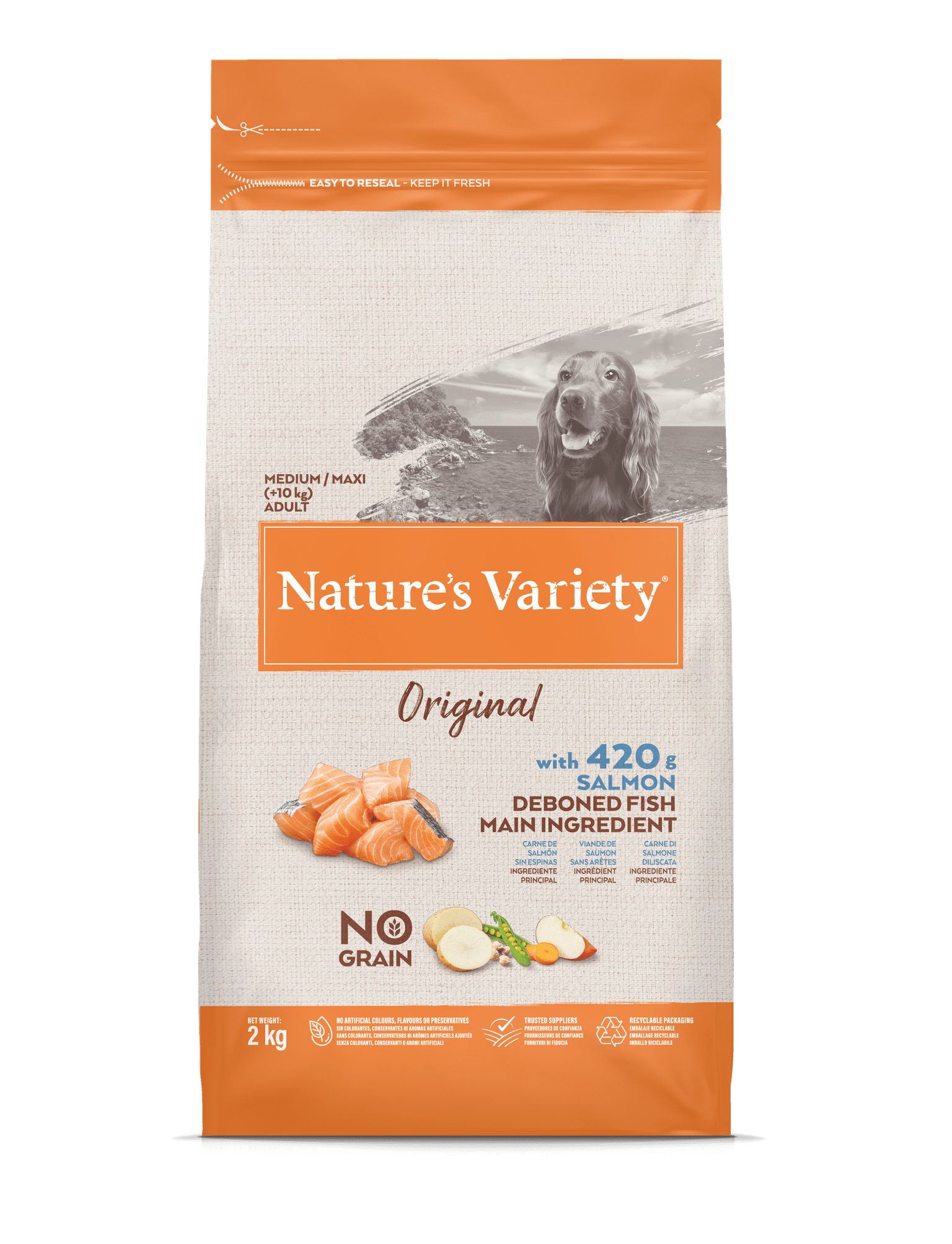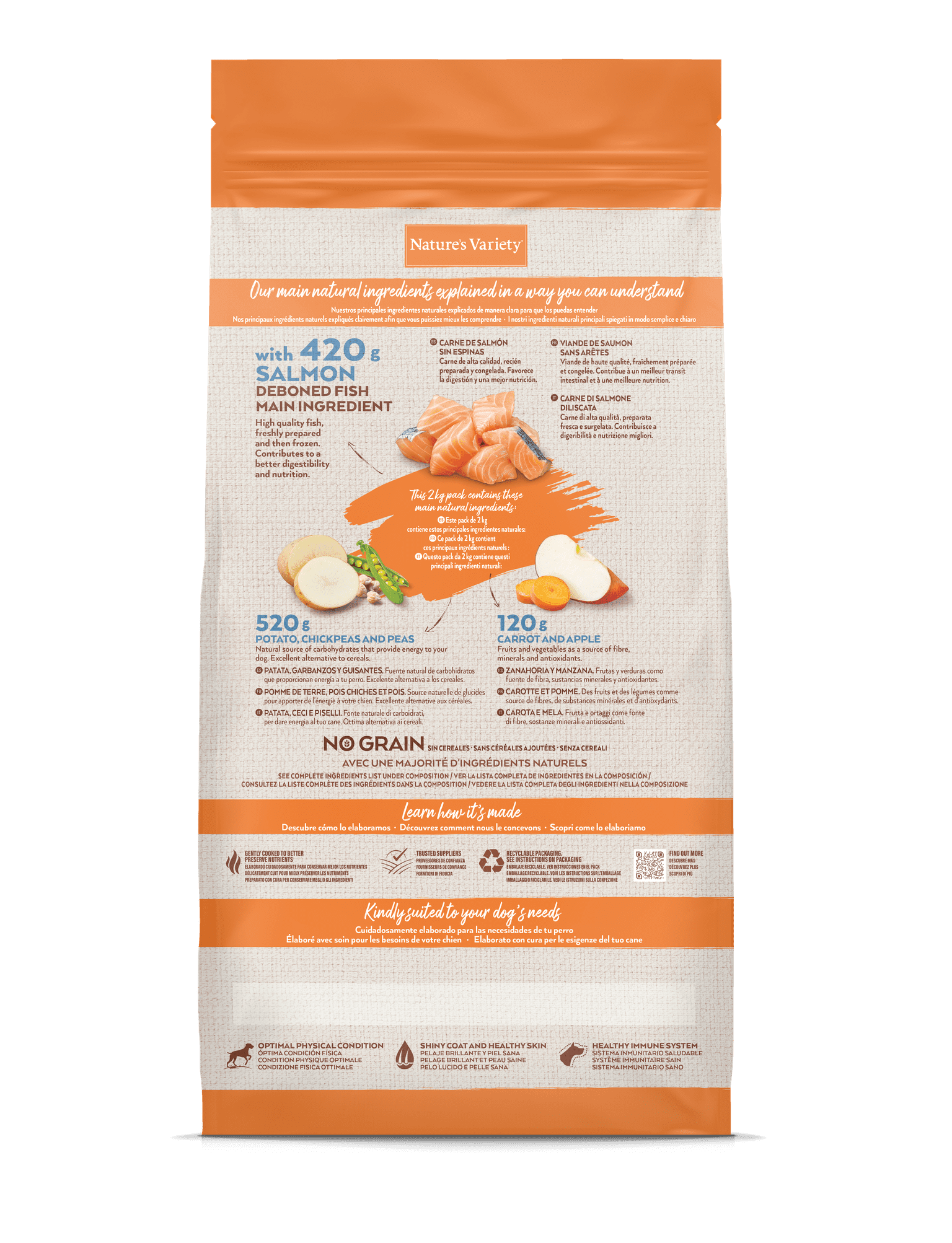 Begrūdis vidutinių ir didelių veislių šunų pašaras. Iškaulinta lašiša yra pagrindinis ingredientas, kartu su kruopščiai atrinktais vaisiais ir daržovėmis bei natūraliais alternatyvių angliavandenių šaltiniais.