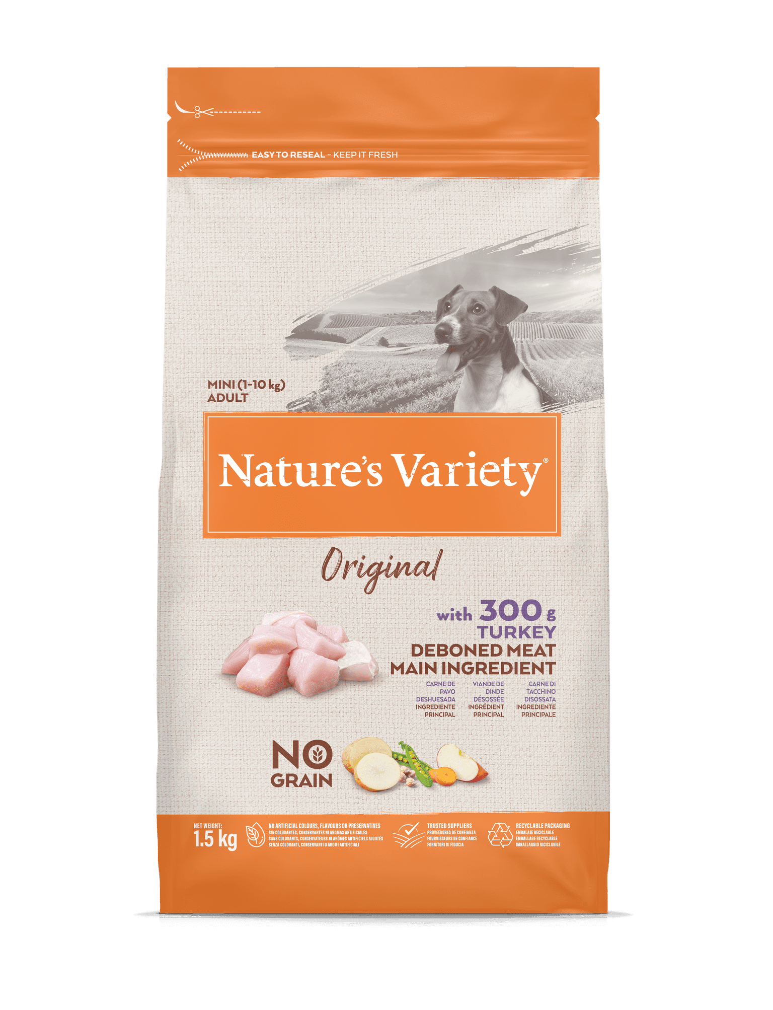 Begrūdis mažų veislių šunų pašaras. Iškaulinta kalakutiena yra pagrindinis ingredientas, kartu su kruopščiai atrinktais vaisiais ir daržovėmis bei natūraliais alternatyvių angliavandenių šaltiniais.