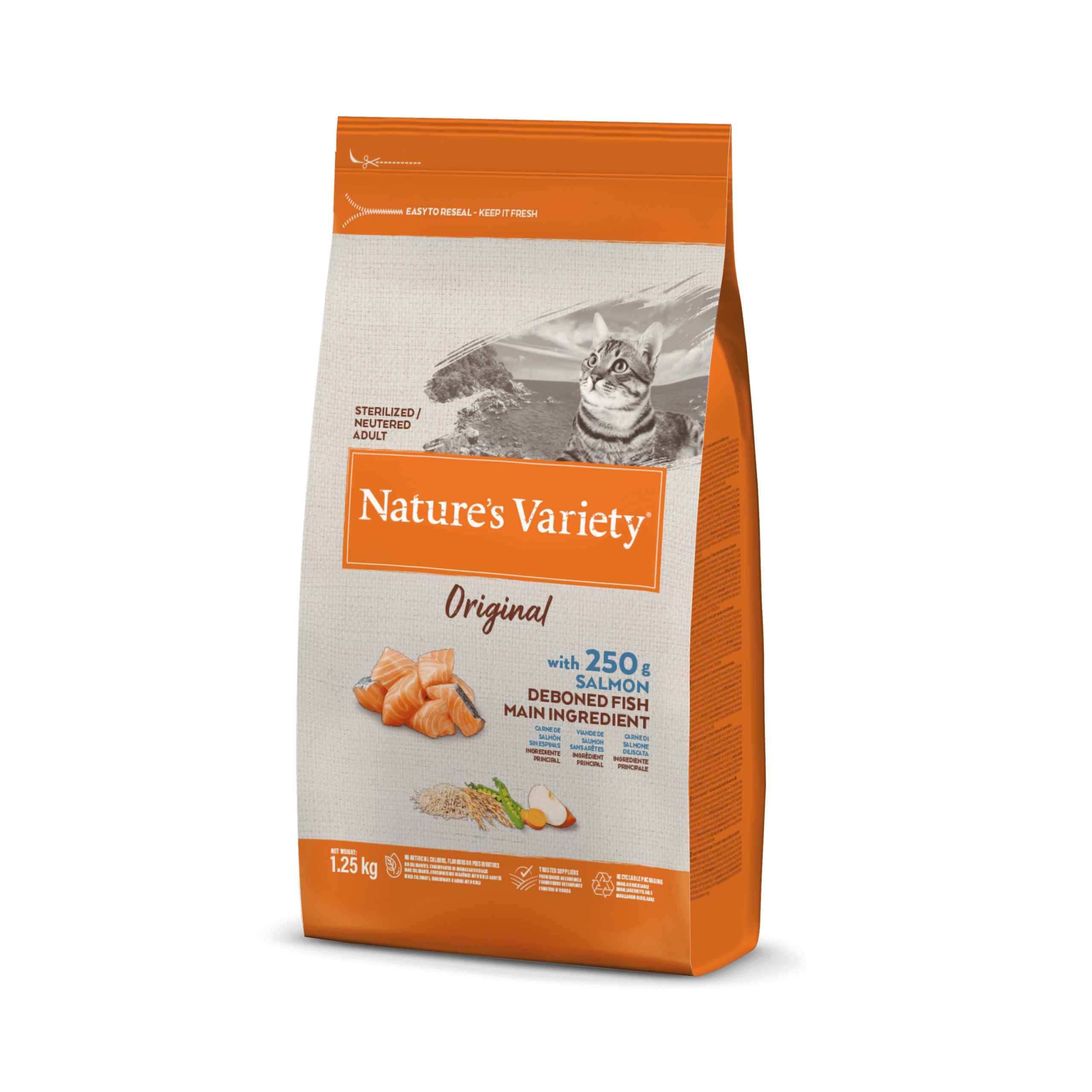 Iškaulinta lašiša* (20%), džiovintų lašišų baltymai (12%), rudieji ryžiai* (12%), kukurūzų baltymai, džiovinti žirniai* (12%), bulvių baltymai, džiovinti tunų baltymai (4%), avižos* (4%), paukštienos riebalai* (3,5%), baltymų hidrolizatas (3%), mineralai, džiovintos morkos* (0.5% atitinka 4% šviežių morkų), džiovinti obuoliai* (0.3% atitinka 2% šviežių obuolių). *Natūralūs ingredientai.