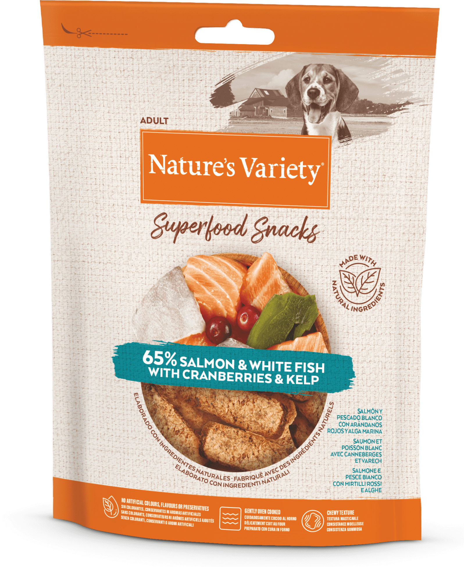 Pašaro papildai su lašiša, balta žuvimi, spanguolėmis ir rusvaisiais dumbliais. Kepti orkaitėje. Jokių dirbtinių dažiklių, skonio stipriklių ir konservantų.