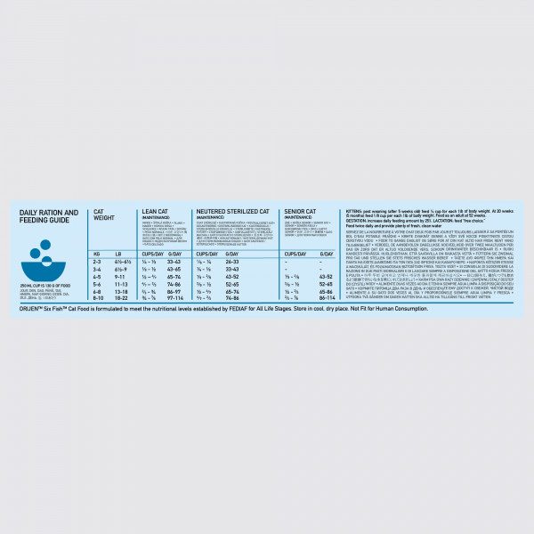 Aprūpinkite savo augintinį visomis reikalingomis maistinėmis medžiagomis su ORIJEN. Katės iš prigimties yra mėsėdės, todėl joms reikia biologiškai tinkamo maisto, kuriame gausu baltymų, riebalų ir įvairių gyvūninės kilmės ingredientų. ORIJEN Six Fish receptas yra gaminamas iš neapdirbtų sardinių, jūrų lydekų ir skumbrių. Recepte taip pat naudojami organai ir kaulai – pagal viso grobio (WholePrey) principą.