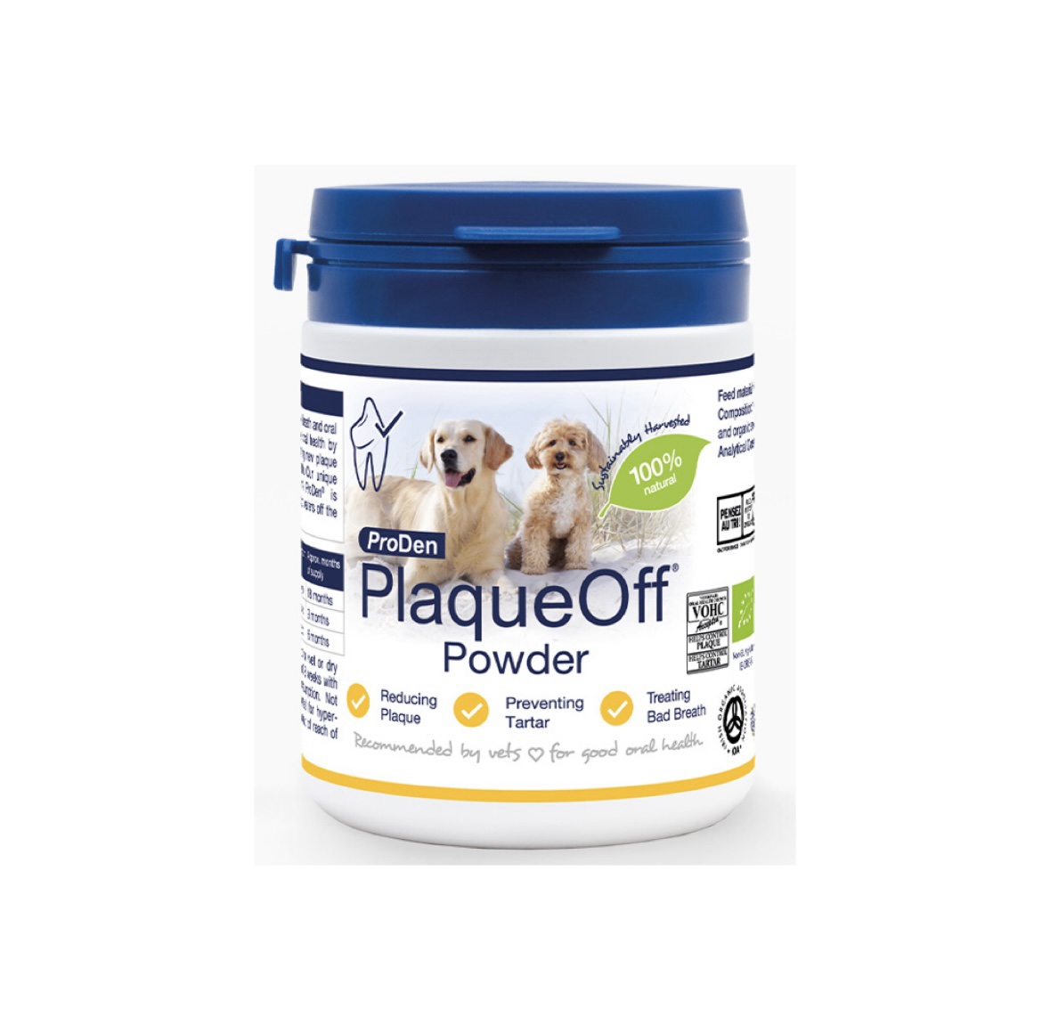 ProDen PlaqueOff® milteliai šunims yra 100% natūrali pašarinė žaliava, kurios sudėtyje yra natūralių dumblių (Ascophyllum nodosum). Klinikiniais tyrimais įrodyta, kad jie padeda sumažinti apnašas ir dantų akmenis bei gali pagerinti blogą burnos kvapą. Rezultatai paprastai pastebimi po 3 – 8 savaičių, nuolat vartojant.