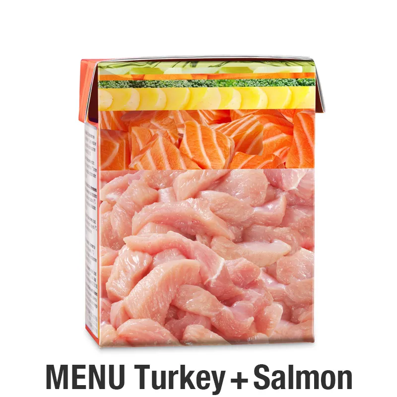 Šviežia kalakutiena (63 %), šviežia lašiša (20 %), dehidruotos bulvės, dehidruotos daržovės (brokoliai,morkos,porai), alyvuogių aliejus.
