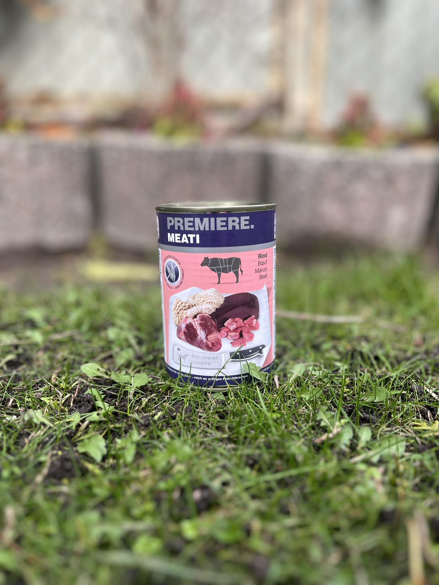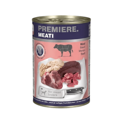 PREMIERE šlapias maistas šunims – grynas mėsos malonumas! Subalansuotas šlapias maistas su gryna mėsa suaugusiems šunims. Aukštos kokybės ingredientai ir švelnus apdorojimas garantuoja puikų suderinamumą. 71% mėsos ir gyvūninės kilmės komponentų: didelė mėsos dalis ir sultingi, natūralūs mėsos gabaliukai „PREMIERE Meati” daro šį gaminį tokį ypatingą ir skanų. Sėmenų aliejuje esančios polinesočiosios omega-3 riebalų rūgštys gali palaikyti organizmo apsaugą bei prisidėti prie ląstelių apsaugos. Optimalus virškinimas: runkelių skaidulose esantis stambus pašaras skatina optimalų virškinimą.