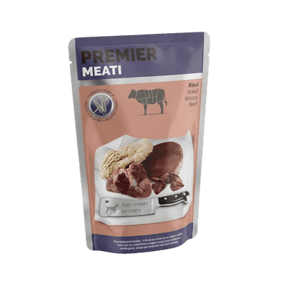 PREMIERE šlapias maistas šunims – grynas mėsos malonumas! Subalansuotas šlapias maistas su gryna mėsa suaugusiems šunims. Aukštos kokybės ingredientai ir švelnus apdorojimas garantuoja puikų suderinamumą. 71% mėsos ir gyvūninės kilmės komponentų: didelė mėsos dalis ir sultingi, natūralūs mėsos gabaliukai „PREMIERE Meati” daro šį gaminį tokį ypatingą ir skanų. Sėmenų aliejuje esančios polinesočiosios omega-3 riebalų rūgštys gali palaikyti organizmo apsaugą bei prisidėti prie ląstelių apsaugos. Optimalus virškinimas: runkelių skaidulose esantis stambus pašaras skatina optimalų virškinimą.