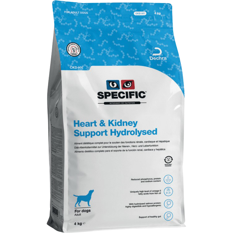 SPECIFIC® Heart & Kidney Support Hydrolysed – tai visavertis sausas pašaras, skirtas širdies, kepenų ir inkstų funkcijai palaikyti suaugusiems šunims, sergantiems lėtiniu inkstų nepakankamumu.