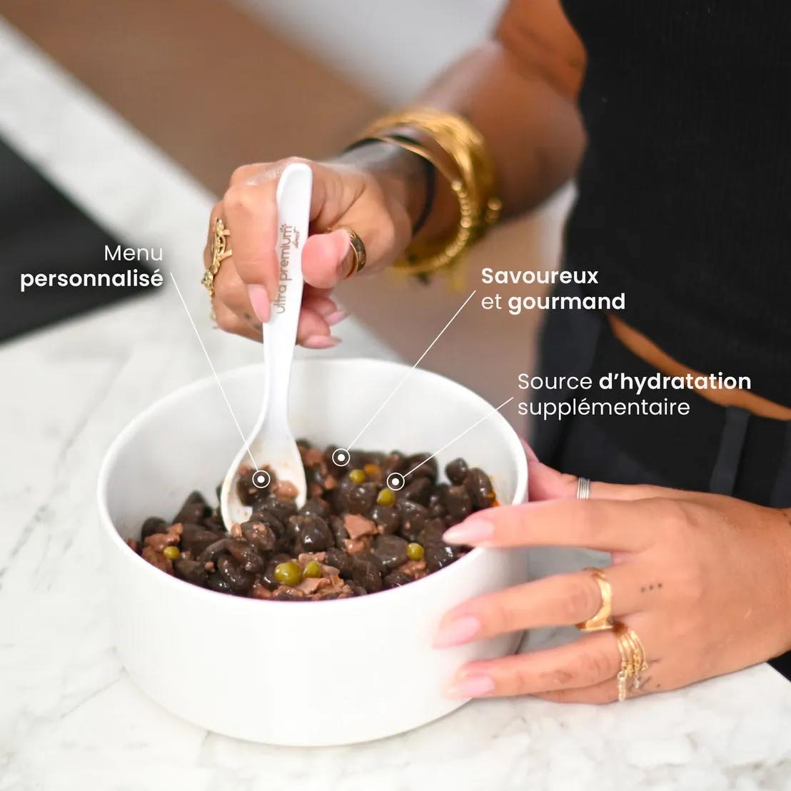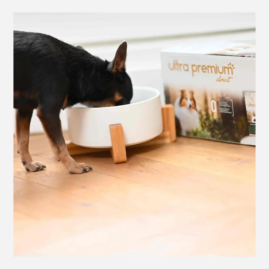 filė 24% (iš jų vištiena 70%, kiauliena, lašiša 9%), žirniai (0,5% dehidratuoti žirniai, atitinka 5% žirnių), runkelių minkštimas, mineralai, žirnių pluoštas, petražolės 0,1%.